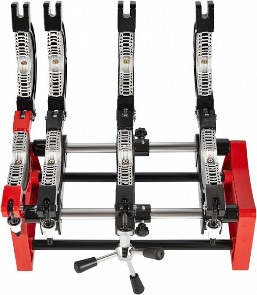 - Центратор с 4-мя откидными зажимами и фиксатором имеет большой запас прочности за счет качественного сплава и ребер жесткости, что позволяет сваривать полимерные трубы с любым показателем SDR