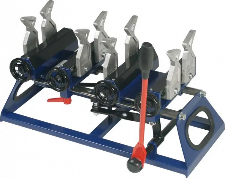 - Имеет по 2 зажима для труб и фитингов с каждой стороны. Каждый из 4-х зажимов сводится и разводится вращением зажимной рукояти соответствующего зажима, независимо от других зажимов. Это позволяет производить сварку труб электромуфтами или даже сварку стальных труб